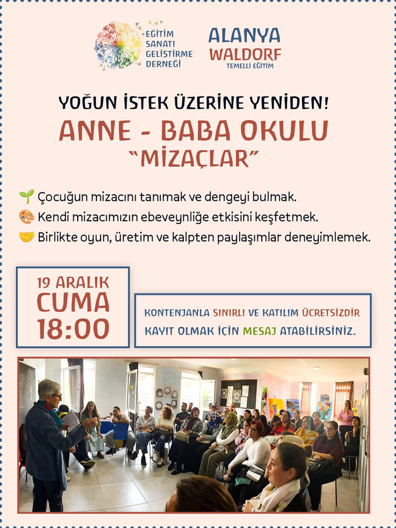 çocuk–yetişkin ilişkisine mizaçlar üzerinden sevgi ve dengeyle bakmayı önerir. Bu buluşma Türkü Çetin ve Hande Başaran tarafından yürütülecektir.